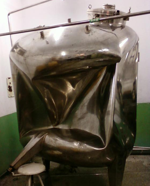 殊不知,这时系统里充满了很热的饱和水蒸汽,而料液一般来说温度较低。这样会导致容器内的蒸汽骤然冷却,产生“相变”(由“汽相”到“液相”)成了凝水,瞬间大大缩小了体积,形成真空负压的状态,使容器被大气压所“压瘪”,即专业上所称的“失稳”现象,造成设备损坏。